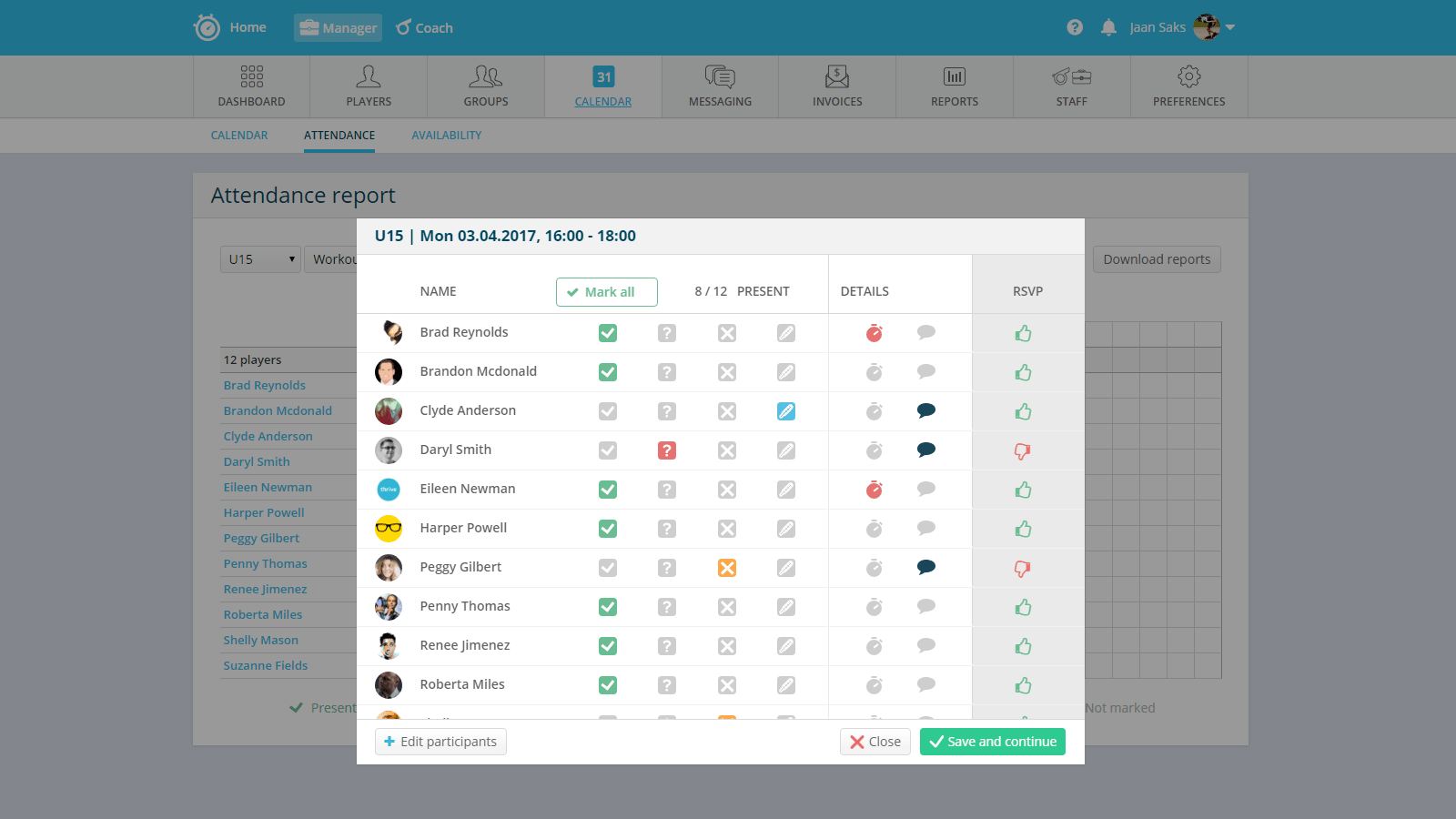 Όλοι οι προπονητές και οι διαχειριστές του συλλόγου μπορούν να καταγράψουν παρουσίες για όλες τις προπονήσεις. Αυτό σημαίνει, ότι ένας προπονητής μπορεί εύκολα να τις καταγράψει για άλλον προπονητή αν ο άλλος δεν μπορεί να παραβρεθεί στην προπόνηση. Οι παρουσίες μπορούν να καταγραφούν για όλα τα μέλη του γκρουπ της προπόνησης ή οποιουδήποτε άλλου αθλητή της ακαδημίας.